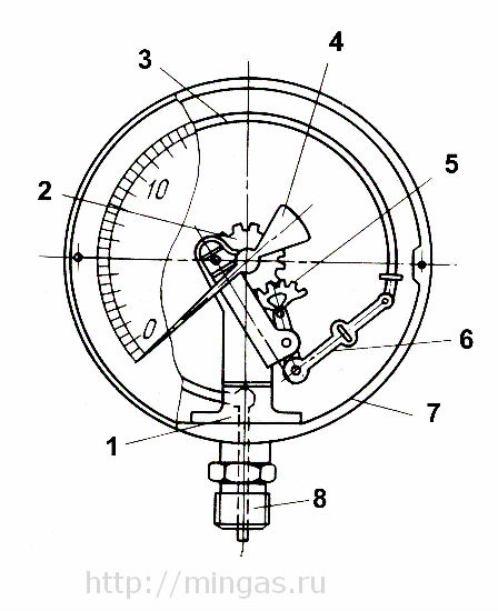 Манометр за счет упругой деформации чувствительных элементов (трубка Бурдона, диафрагменная коробка, сильфон), а затем деформация давления передается на стрелку механизмом преобразования движения в таблице, заставляя стрелку вращаться для отображения давление.