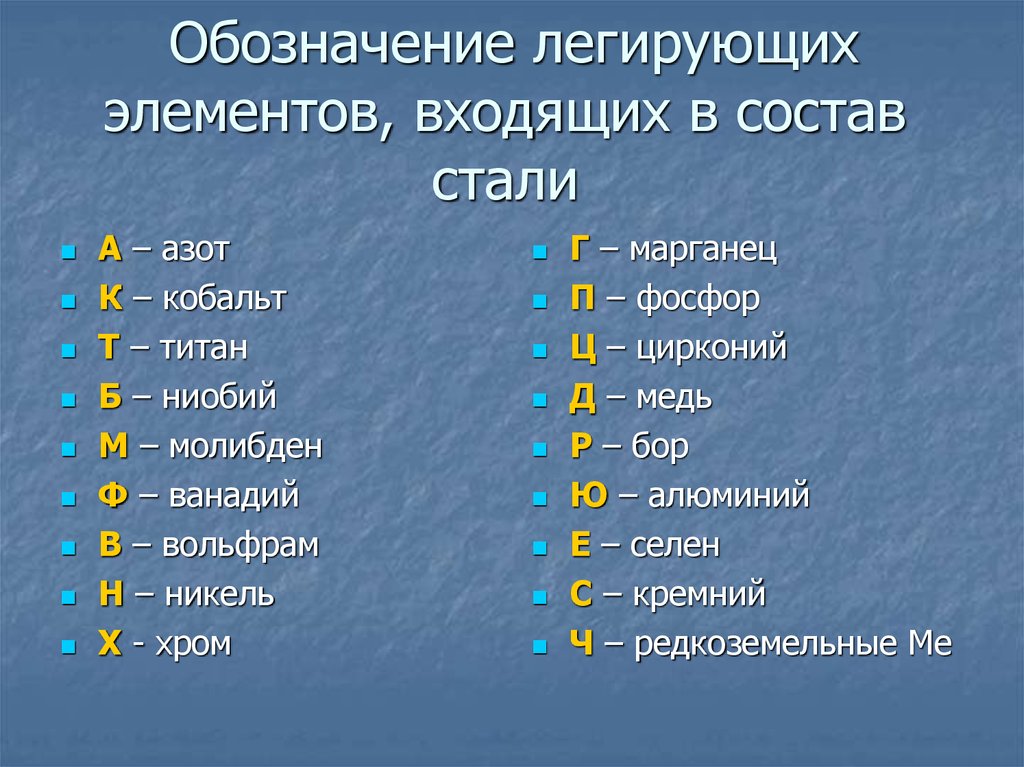 Общими для всех обозначениями являются буквенные обозначения легирующих элементов: