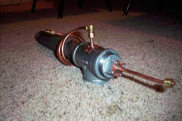 - Топливный тракт делают из медной трубки, один конец которой трижды обматывают вокруг сопла, а затем через переходник-заглушку выводят в корпус в верхней части. Топливную трубу подключают к насосу, устанавливают сетчатый фильтр грубой очистки и заводят другой конец тракта в бак. Топливный тракт можно оснастить вентилем. Насос подключают к электродвигателю, работающему от сети 220 В.