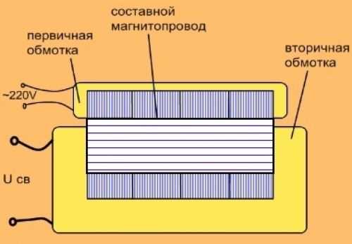 Первый вариант самый простой. Его принцип работы заключается в понижении напряжения сети, чем обычно и занимаются трансформаторы. Проходя через первичную и вторичную обмотку, меняется сила тока, которая требуется для сварки.