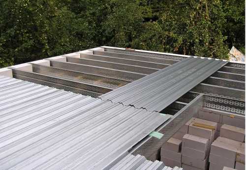 - Несущий профлист. Для производства такого материала используется более толстая сталь, чем в предыдущем варианте, а высота профиля может быть более 10 см. Несущая способность имеет более высокие показатели, что позволяет использовать такой вид покрытия при строительстве ангаров и гаражей. Допускается покрывать несущим профнастилом плоские и односкатные крыши большой площади.