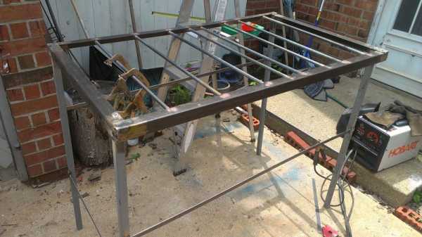 - После этого своими руками приваривают столешницу к подготовленной раме. С этой целью используют металлическую пластину, к которой прикладывается рама.