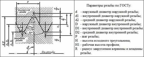 Нормативным документом, в котором оговариваются требования к размерам цилиндрической дюймовой резьбы, является ГОСТ 6111-52. Как и любая другая, дюймовая резьба характеризуется двумя основными параметрами: шагом и диаметром. Под последним обычно подразумевают: