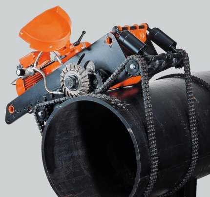 - Цепной – режущий элемент состоит из цепи с валиками для резки. Кроме того, устройство включает натяжной механизм и поворотные рычаги. Цепь затягивается вокруг водовода при помощи рычагов и врезается в материал. Для пластика используется нечасто, в основном цепной механизм применяют при резке чугуна и керамики с большим сечением – 110 мм и выше.
